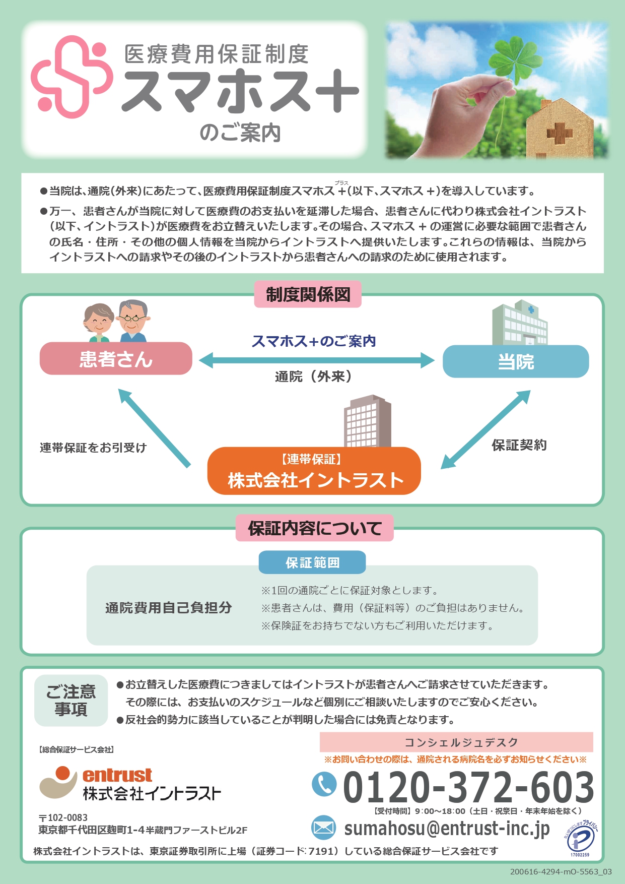 医療費用保証制度は、通院の患者さんが当院に対して、万一医療費のお支払いを延滞した場合、患者さんの代わりに(株)イントラストが医療費を当院に立替払いし、立替した医療費を(株)イントラストから患者さんへ請求させていただく制度となります。