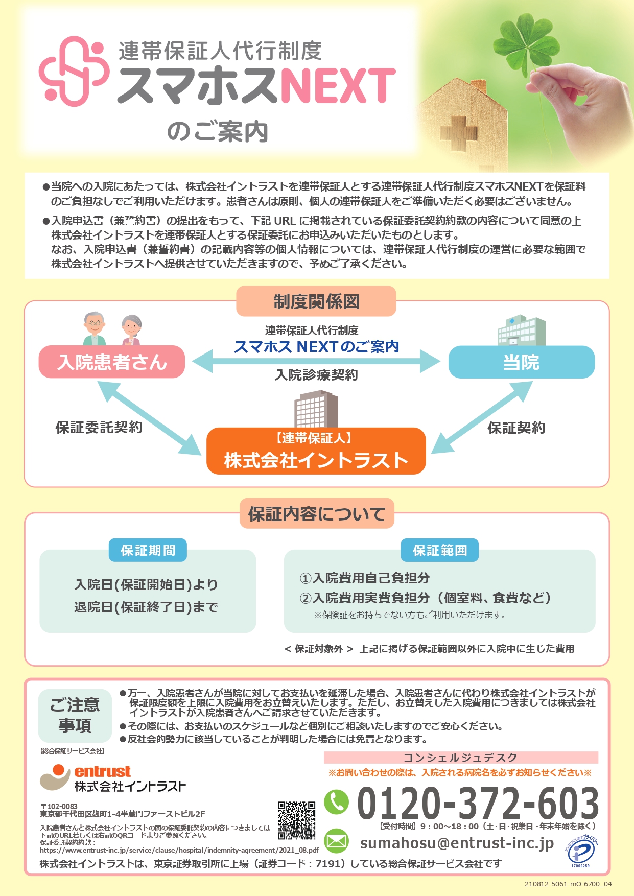 連帯保証人代行制度は、当院への入院にあたって、(株)イントラストを連帯保証人とし、患者さんは原則、個人の連帯保証人をご準備いただく必要はなくなり、万一入院患者さんが当院に対し入院費用のお支払いを延滞した場合、入院患者さんの代わりに(株)イントラストが入院費用を当院に立替払いし、立替した入院費用は(株)イントラストから患者さんへ請求させていただく制度となります。